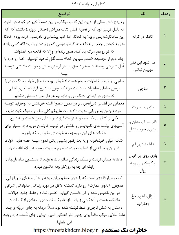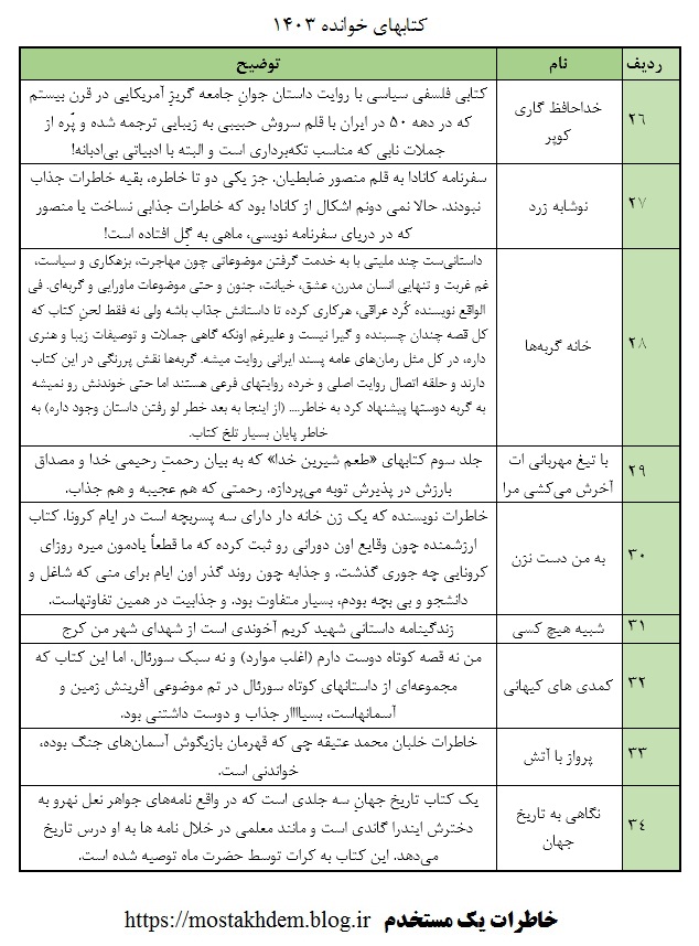 شکر خدا توفیق همنشینی و معاشرت با پنجاه و پنج کتاب رو در سال هزار و چهارصد و دو داشتم.