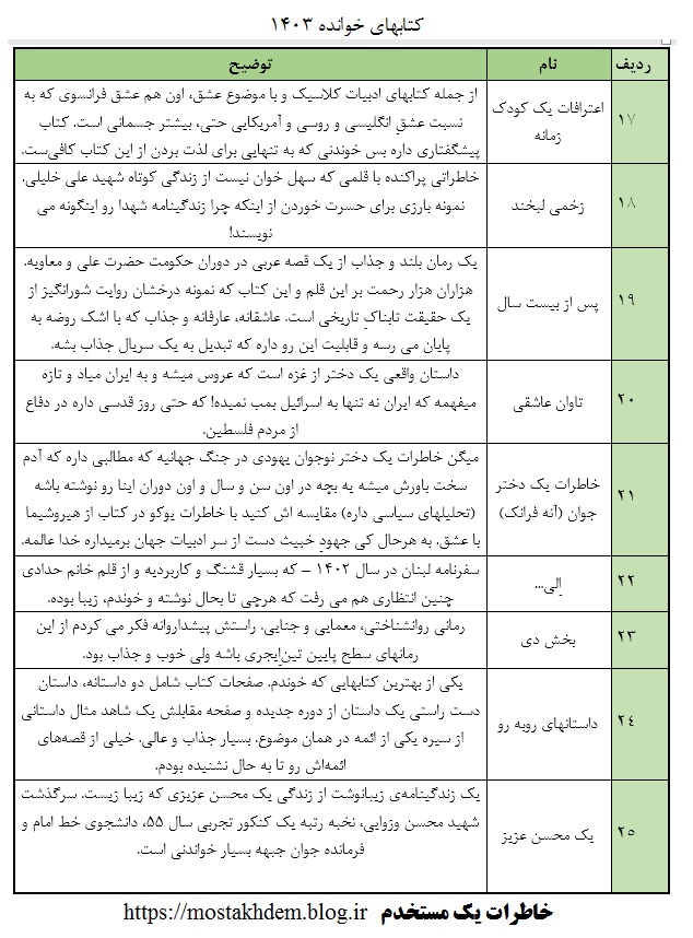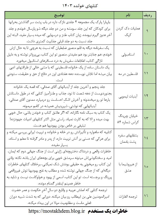 بازم میگم: ترتیب کتابها در هر دسته، ترتیبِ زمانیِ خوندنشون هست، نه درجهبندی خوبتر/بدتر بودنشون.
